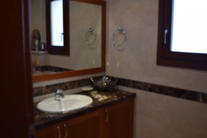 The luxury Italian kitchen is made of hard wood with granite worktops. It is fully equipped and includes extras such as a dishwasher, an ice maker and blender. There is also an island in the middle with oven and hob. The family dining table seats 8 and is close to the doors that open up to the patio and garden. There is a WC on the ground floor just off the lounge.
