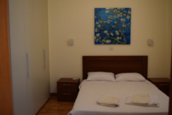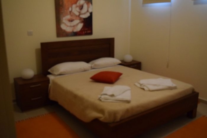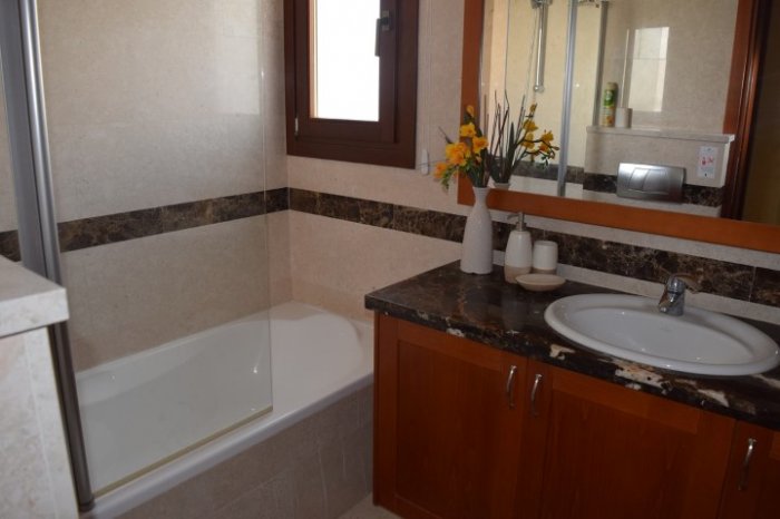 Also on the first floor is one of the two double bedrooms, with a double bed, a chest of drawers, bedside cabinets and fitted wardrobes. There is an en-suite shower and a verandah overlooking the pool area.