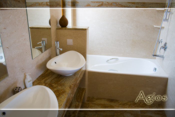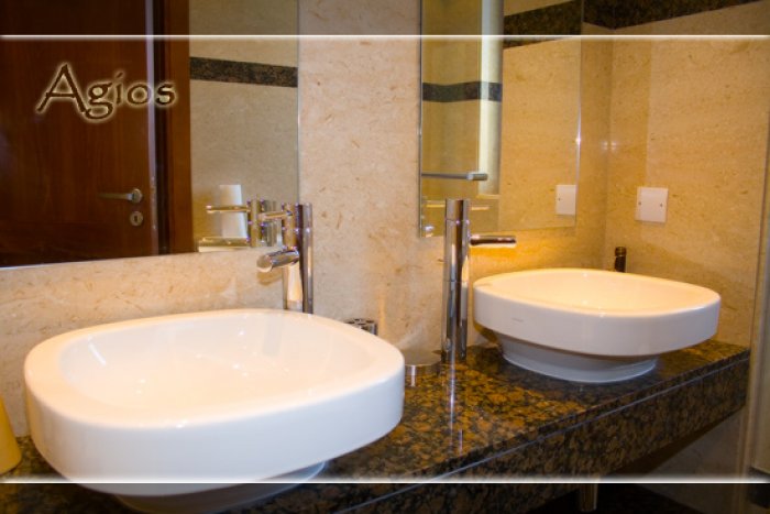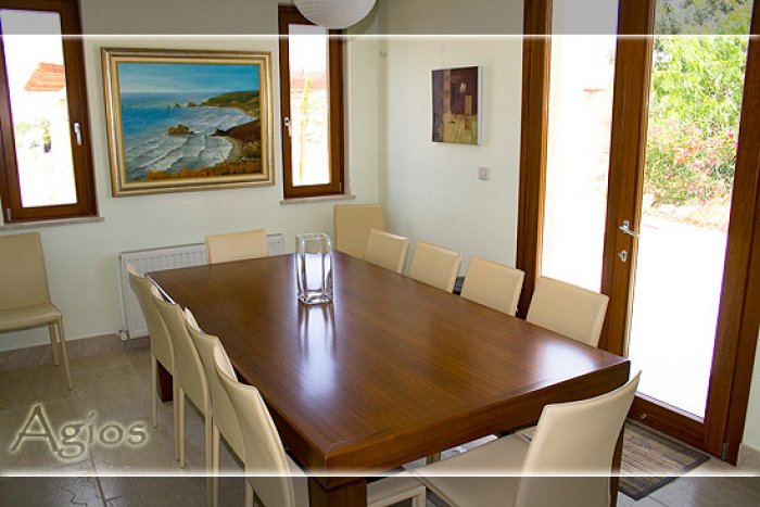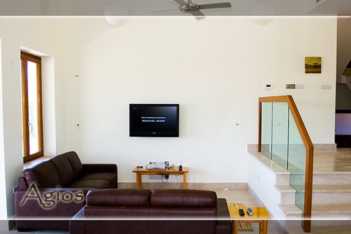 A spacious double lounge runs for almost the full length of the villa. Being at a slightly lower level from the kitchen and dining area and separated from them by a stunning glass partition, makes this an extremely large and luxurious living and entertainment area. The lounge benefits from the many doors that lead out to the patio, views from inside are of the Aphrodite Hills ravine, 5 star.